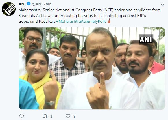 राष्ट्रवादी कांग्रेस पार्टी (एनसीपी) के वरिष्ठ नेता और बारामती से प्रत्याशी अजीत पवार ने अपना वोट डाला है। वह भाजपा के गोपीचंद पडलकर के खिलाफ चुनावी मैदान में उतरे हैं। पूर्व मुख्यमंत्री अशोक चव्हाण और महाराष्ट्र सरकार के शिक्षा मंत्री आशीष शेलार ने भी अपना वोट डाला।