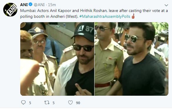 अभिनेता ऋतिक रोशन और अनिल कपूर ने अंधेरी(पश्चिम) के एक पोलिंग बूथ पर अपना वोट डाला।