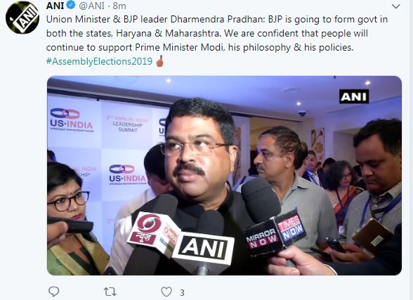 केंद्रीय मंत्री और भाजपा नेता धर्मेंद्र प्रधान ने विधानसभा चुनावों में भाजपा की जीत को लेकर बड़ा दावा किया है। धर्मेंद्र प्रधान ने कहा है कि भाजपा दोनों ही राज्यों(हरियाणा और महाराष्ट्र) में सरकार बनाने जा रही है। साथ ही उन्होंने कहा कि हमें विश्वास है कि लोग प्रधानमंत्री मोदी, उनके दर्शन और उनकी नीतियों का समर्थन करते रहेंगे।'