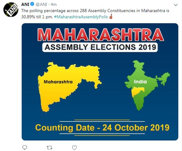 महाराष्ट्र में 288 विधानसभा सीटों के लिए वोटिंग जारी है। समाचार एजेंसी एएनआइ के मुताबिक दोपहर 1 बजे तक 30.89 फीसदी मतदान हुआ है।