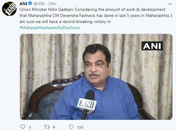 केंद्रीय मंत्री नितिन गडकरी ने महाराष्ट्र चुनावों में भाजपा की जीत का दावा किया है। गडकरी ने कहा कि महाराष्ट्र में पिछले 5 सालों में महाराष्ट्र के सीएम देवेंद्र फडणवीस ने जो काम और विकास किया है, उसे देखते हुए मुझे यकीन है कि हमारे पास रिकॉर्ड तोड़ जीत होगी।