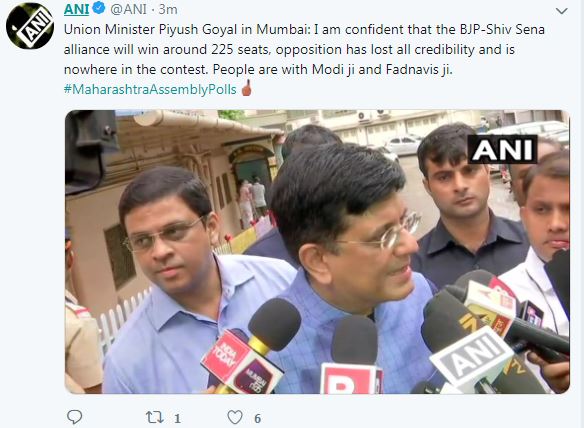 मुंबई में केंद्रीय मंत्री पीयूष गोयल अपना वोट डालने पहुंचे। इस दौरान उन्होंने कहा कि भाजपा-शिवसेना गठबंधन लगभग 225 सीटों पर जीत हासिल करेगा, विपक्ष सभी विश्वसनीयता खो चुका है और कहीं नहीं है। लोग मोदी जी और फडनवीस जी के साथ हैं।