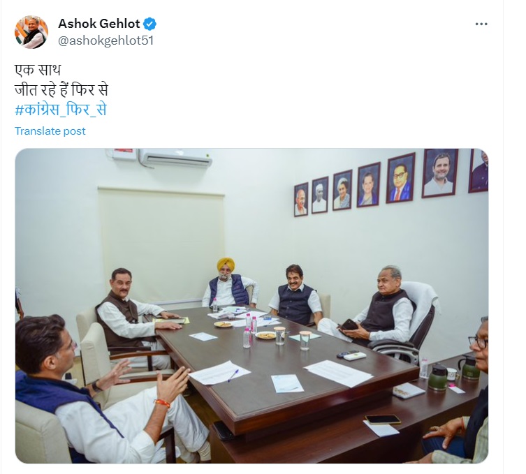 तस्वीर साझा करते हुए सीएम गहलोत ने लिखा,"एक साथ जीत रहे हैं फिर से।" इस तस्वीर में तस्वीर में दोनों को महासचिव केसी वेणुगोपाल सहित सत्तारूढ़ कांग्रेस के अन्य लोगों के साथ बैठक करते हुए दिखाया गया है।