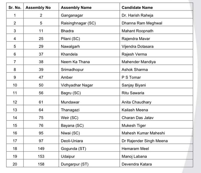 आम आदमी पार्टी ने गंगानगर से हरीश रहेजा, रायसिंहनगर से धन्ना राम मेघवाल, भादरा से महंत रूपनाथ, पिलानी से राजेंद्र मावर और नवलगढ़ से विजेंद्र डोटासरा पर दांव लगाया।