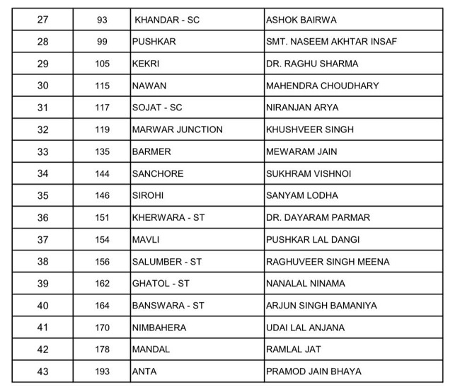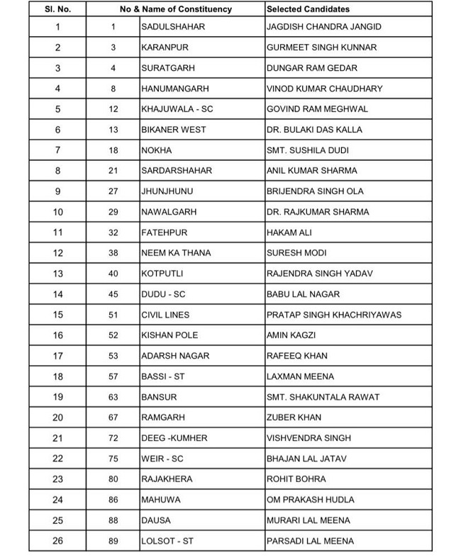 विनोद कुमार को हनुमानगढ़, सुशीला डूडी से नोखा, अनिल कुमार शर्मा को सरदारशहर, राजकुमार शर्मा को नवलगढ़, हाकमअली को फतेहपुर, सुरेश मोदी को नीम का थाना, अमिन कागजी को किशनपोल, रफीक खान को आदर्श नगर, लक्ष्मणमीणा को बस्सी, शकुंतला रावत को बानसूर, रोहित बोहरा को राजाखेड़ा, अशोक बैरवा को खंडार, नसीम अख्तर को पुष्कर, रघु शर्मा को केकडी, महेंद्र चौधरी को नांवा, सुखराम विश्नोई को सांचौर, मेवाराम को बाड़मेर, दयाराम परमार को खेरवाड़ा, पुष्कर लाल को मावली, रघुवीर मीणा को सलूंबर एवं अर्जुन लाल बामनिया को बांसवाड़ा से टिकट दिया गया है।