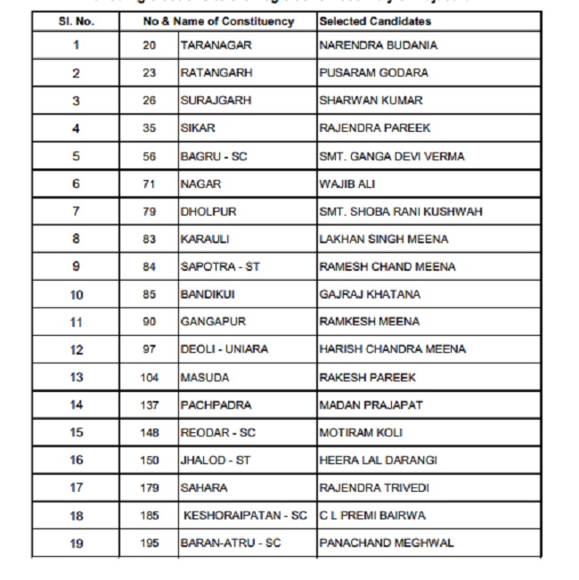 नरेंद्र बुडानिया को तारानगर, पुसाराम गोदारा को रतनगढ़, राजेंद्र पारीक को सीकर, श्रवण कुमार को सुरजगढ़, गंगादेवी को बगरू, लाखन मीणा को करौली, मदन प्रजापत को पचपदरा, मोतीराम कोली को रेवदर, हीरालाल को झाड़ोल, सी.एल. प्रेमी को केशवरायपाटन और पानाचंद मेघवाल को बारां-अटरू सीट से टिकट दिया गया है।