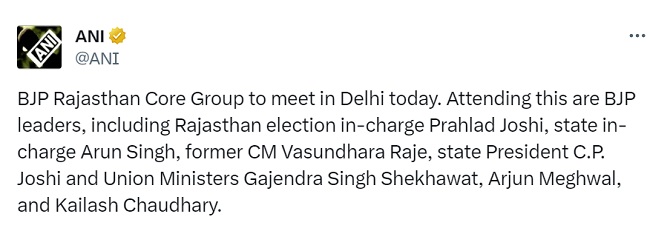 एएनआई, नई दिल्ली। राजस्थान में होने वाले विधानसभा चुनाव को लेकर आज भाजपा राजस्थान कोर ग्रुप की दिल्ली में बैठक होगी। इस बैठक में राजस्थान के बीजेपी प्रभारी प्रह्लाद जोशी, राज्य प्रभारी अरुण सिंह शामिल होंगे।
