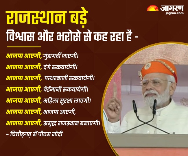प्रधानमंत्री ने कहा कि राजस्थान बड़े विश्वास और भरोसे से कह रहा है - भाजपा आएगी, गुंडागर्दी जाएगी। भाजपा आएगी, दंगे रुकवायेगी। भाजपा आएगी, पत्थरबाजी रुकवायेगी। भाजपा आएगी, बेईमानी रुकवायेगी। भाजपा आएगी, महिला सुरक्षा लाएगी। भाजपा आएगी, रोजगार लाएगी। भाजपा आएगी, समृद्ध राजस्थान बनाएगी।