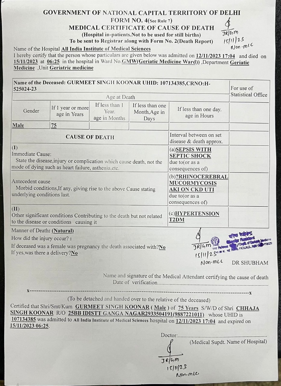 करणपुर से मौजूदा विधायक कूनर को 12 नवंबर को दिल्ली के अखिल भारतीय आयुर्विज्ञान संस्थान (AIIMS) के जेरिएट्रिक मेडिसिन वार्ड में भर्ती कराया गया था। अस्पताल द्वारा जारी मृत्यु प्रमाण पत्र के अनुसार, कूनर की मृत्यु सेप्टिक शॉक और गुर्दे की बीमारी से हुई। बता दें कि वह उच्च रक्तचाप से भी पीड़ित थे।