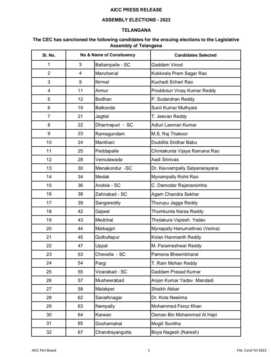 ए रेवंत रेड्डी को कोडंगल विधानसभा क्षेत्र से टिकट दिया गया है। वहीं, एन उत्तम कुमार रेड्डी को हुजूरनगर से और कोमाटिरेड्डी वेंकट रेड्डी को नलगोंडा विधानसभा क्षेत्र से टिकट दिया गया है। पार्टी ने जानकारी दी है कि शेष 64 सीटों के लिए उम्मीदवारों के नाम एक या दो दिन में तय किए जाएंगे और जल्द ही घोषणा की जाएगी।