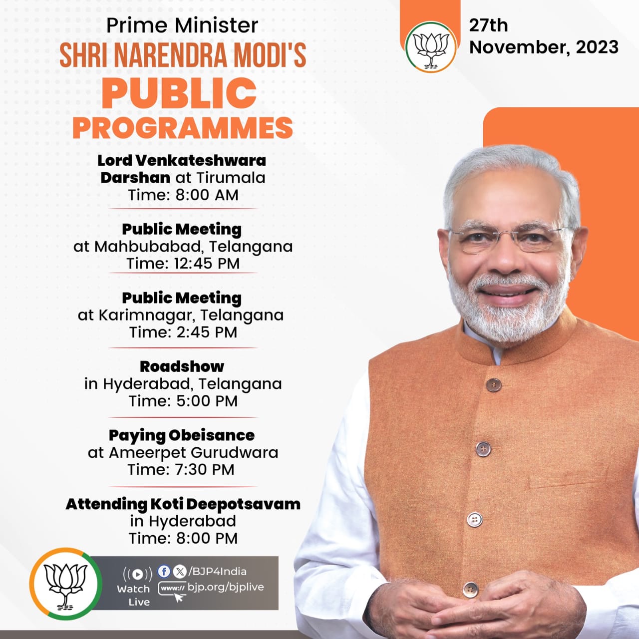 भगवान वेंकेटश्वर की पूजा के बाद पीएम मोदी दोपहर 12ः45 बजे मुरादनगर में जनसभा को संबोधित करेंगे। 2ः45 बजे करीमनगर में जनसभा करेंगे। शाम 5 बजे हैदराबाद में रोड शो करेंगे। 7ः30 बजे अमीरपट गुरुद्वारा जाएंगे। रात 8 बजे हैदराबाद में कोटी दीपोत्सव कार्यक्रम में हिस्सा लेंगे।