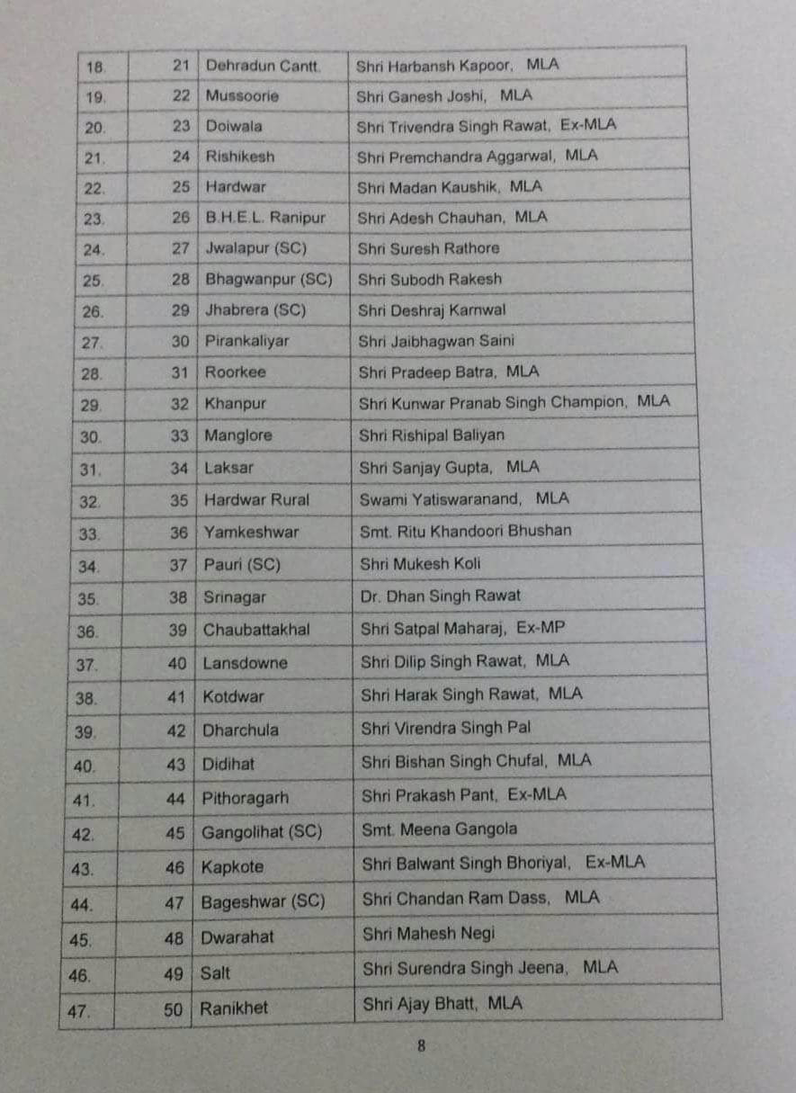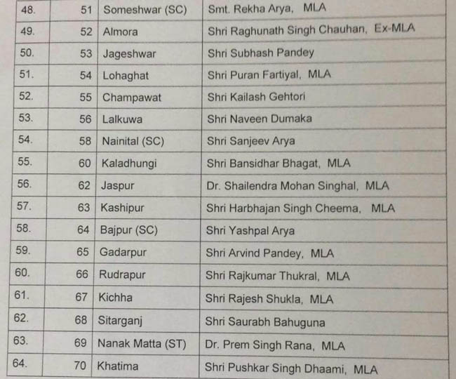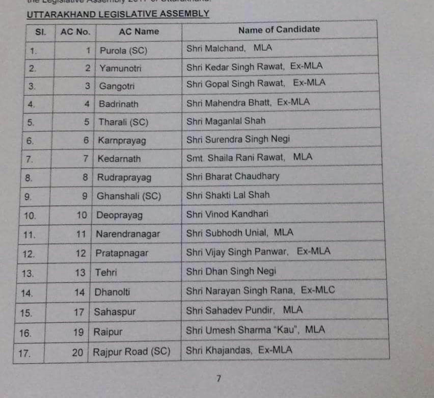 हरिद्वार की ज्वालापुर सीट से चंद्रशेखर भट्टेवाले, पौड़ी गढ़वाल की यमकेश्वर सीट से विजया बड़थ्वाल व चौबट्टाखाल से तीरथ सिंह रावत और टिहरी की धनोल्टी सीट से महावीर रांगड़ पर पार्टी ने इस बार पर दांव नहीं खेला। भाजपा में ही शामिल हुए यशपाल आर्य, उनके पुत्र संजीव आर्य और केदार सिंह रावत को भी प्रत्याशी बनाया है।