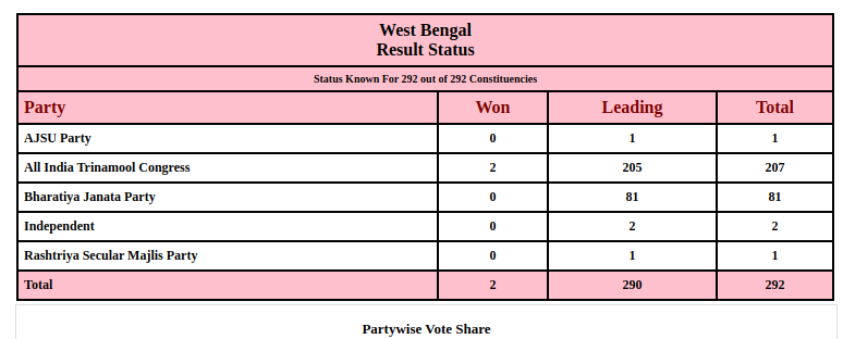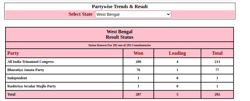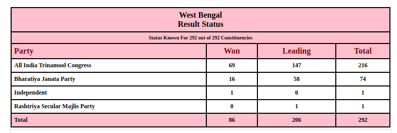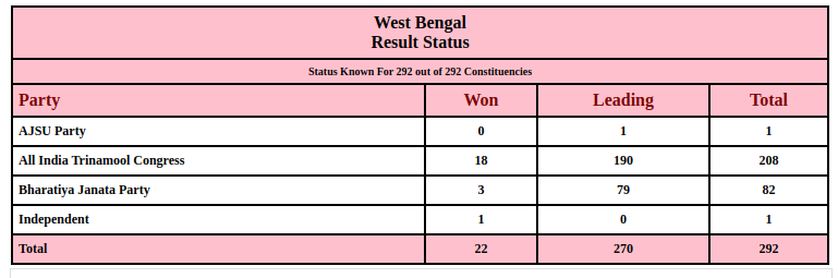 - पश्चिम बंगाल में कांग्रेस और लेफ्ट का पत्ता साफ हो गया है। इनका खाता तक नहीं खुला है। चुनाव आयोग के अनुसार टीएमसी को 213 सीटों पर और भाजपा को 77 सीटों पर जीत मिली है। निर्दल्य और राष्ट्रीय सेकुलर मजलिस पार्टी के खाते में एक-एक सीट आई है।