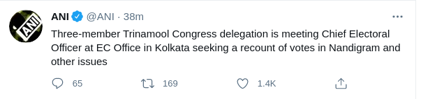 - समाचार एजेंसी एएनआइ के अनुसार तृणमूल कांग्रेस का तीन सदस्यीय प्रतिनिधिमंडल कोलकाता में चुनाव आयोग के कार्यालय में मुख्य निर्वाचन अधिकारी से मिला है और नंदीग्राम में रीकाउंटिंग की मांग की है। वहीं ममता बनर्जी ने कोर्ट भी जाने की बात कही है।