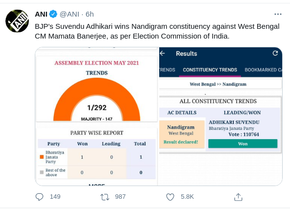 - चुनाव आयोग ने नंदीग्राम से सुवेंदु अधिकारी की आधिकारिक जीत की घोषणा कर दी है। पश्चिम बंगाल की मुख्यमंत्री ममता बनर्जी हार गई हैं। रविवार को सुबह आठ बजे शुरू हुई मतगणना फिलहाल जारी है। सोमवार सुबह 5 बजकर 45 मिनट तक 292 में 287 सीटों के नतीजे आ गए थे। टीएमसी को 209 सीटों पर जीत मिली है। वह चार सीटों पर आगे चल रही है। वहीं भाजपा 76 सीट जीत चुकी है। एक सीट पर आगे चल रही है। निर्दल्य और राष्ट्रीय सेकुलर मजलिस पार्टी के खाते में एक-एक सीट आई है।