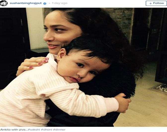 मुंबई। बॉलीवुड एक्टर सुशांत सिंह राजपूत इन दिनों भारतीय क्रिकेट कप्तान महेंद्र सिंह धोनी पर बन रही फिल्म में व्यस्त हैं। वो 'एम एस धोनी : द अनटोल्ड स्टोरी' में धोनी का मुख्य किरदार निभा रहे हैं और फिल्म की वजह से धोनी के साथ उनकी अच्छी दोस्ती हो गई है। इतना ही नहीं, लगता है कि उनकी प्यारी बेटी जिवा के साथ भी वो काफी घुल-मिल गए हैं। दरअसल, सुशांत ने इंस्टाग्राम पर अपनी और गर्लफ्रेंड अंकिता लोखंडे की तस्वीरें शेयर की हैं, जिनमें दोनों लिटिल जिवा के साथ नजर आ रहे हैं।