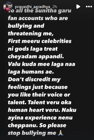 19 वर्षीय सिंगर प्रवास्ति आराध्या ने इंस्टाग्राम पर वीडियो पोस्ट करके सबको चौंका दिया। इस वीडियो में सिंगर ने पदुथा थेयागा सिल्वर जुबली सीरीज के जजों और प्रोडक्शन टीम पर उत्पीड़न पक्षपात और बॉडी शेमिंग का आरोप लगाया है। उन्होंने गायिका सुनीता उपद्रष्टा पर विशेष रूप से उनके प्रति पक्षपात करने का आरोप लगाया। इसके अलावा उन्होंने शो में पर्दे के पीछे की कुछ घटनाओं को उजागर किया।