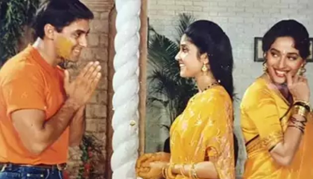 साड़ी के साथ डोरी वाला मैचिंग बैकलेस ब्लाउज और कुंदन का भारी नेकलेस। साड़ी पहनने का माधुरी का अंदाज यानी सीधा पल्लू। यह अनायास नहीं था कि इस फिल्म के पोस्टर पर माधुरी दीक्षित को इसी साड़ी में दिखाया गया। अब भी वो रंग, उस पर की गई कढ़ाई, ब्लाउज विवाह समारोह के समय महिलाओं की पसंद है।