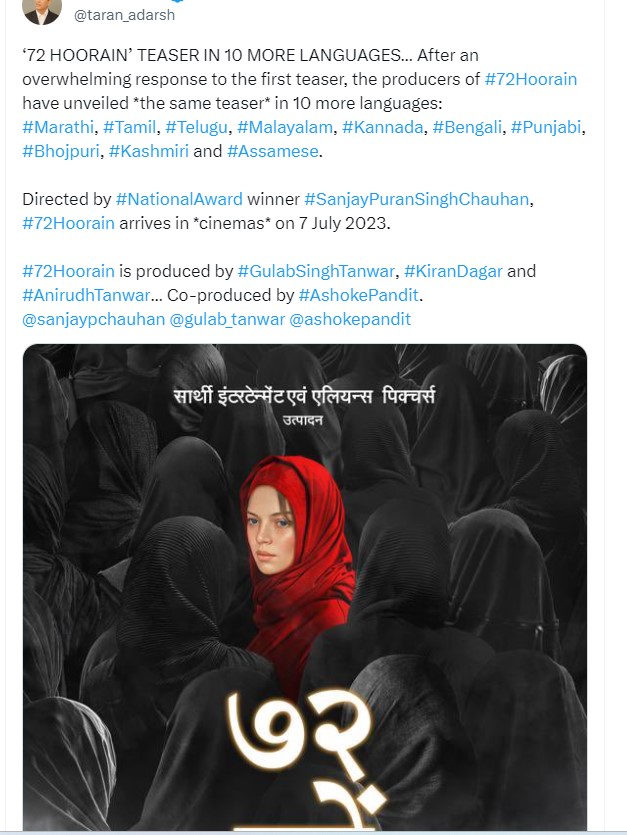 बता दें कि विवादों से घिरी फिल्म '72 हूरें' का अब तक हिंदी टीजर ही जारी किया गया था। लेकिन अब इसके टीजर को 10 और भाषाओं में रिलीज किए जाने का फैसला किया गया है। टीजर को इंग्लिश, मराठी, तमिल, तेलुगू, मलयालम, कन्नड़, बंगाली, पंजाबी, भोजपुरी, कश्मीरी और असमी भाषाओं में रिलीज किया जाएगा।