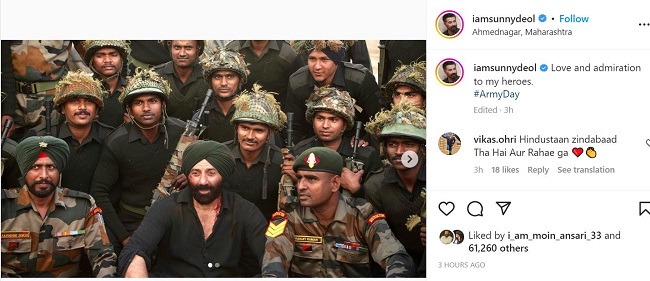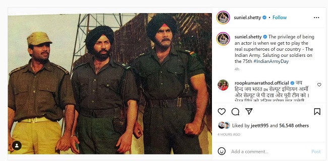 75वें भारतीय सेना दिवस पर सिद्धार्थ मल्होत्रा ने भी एक तस्वीर शेयर की है। इसके साथ उन्होंने लिखा है, 'भारतीय सेना दिवस की शुभकामनाएं।' सुनील शेट्टी ने भी एक फोटो शेयर की है। इसमें उन्हें भारतीय सेना के जवानों के साथ देखा जा सकता है। इसके साथ उन्होंने लिखा है, 'मेरे हीरोज को ढेरों प्यार। आर्मी डे।' इनके अलावा और भी कई कलाकारों ने भारतीय सेना के जवानों का लोहा माना है।