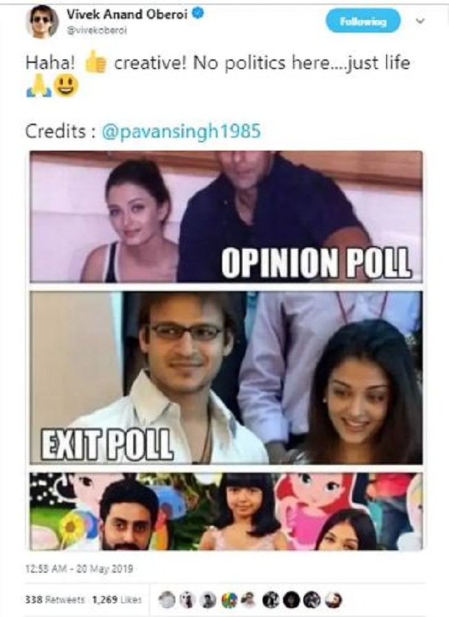 दरअसल, जो फोटो विवेक ने शेयर किया है उसमें सलमान खान और ऐश्वर्या राय की Meme पर ओपिनियन पोल लिखा हुआ हैl वहीं विवेक ओबेरॉय ऐश्वर्या राय की Meme पर Exit Poll लिखा हुआ हैl जबकि अभिषेक बच्चन आराध्या बच्चन और ऐश्वर्या राय बच्चन वाली फोटो पर Result लिखा हुआ हैl विवेक ओबेरॉय ने ट्वीट कर लिखा था, 'हा हा! रचनात्मक है, कोई राजनीति नहीं खेल रहा, यही जीवन हैl'