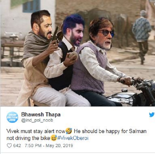 इस मीम में देख सकते हैं कि, अमिताभ बच्चन, अभिषेक बच्चन और सलमान खान एक ही बाइक पर बैठकर निकल पड़े हैं। आपको इस पूरे घटनाक्रम के बारे में बताए तो यह पूरा मामला विवेक ओबेरॉय के ट्वीट का है जो उन्होंने 20 मई को किया था। विवेक ओबेरॉय ने सलमान खान और ऐश्वर्या राय बच्चन व अभिषेक बच्चन को लेकर एक ट्वीट किया जो कि एक मीम था। इसके बाद से ही विवेक ओबेरॉय के इस कदम को लेकर कई सेलेब्स ने नराजगी जताई। यह बात अलग है कि विवेक ने यह मीम मजाक में शेयर किया था लेकिन ऐसा करने विवेक के लिए गलत साबित हुआ।