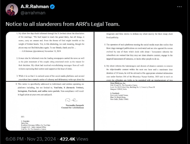 ए आर रहमान ने अपने आधिकारिक एक्स अकाउंट पर एक पोस्ट शेयर किया है, जिस पर लिखा है, 'सभी बदनाम करने वालों के खिलाफ नोटिस जारी'। उन्होंने उनकी एडवोकेट की तरफ से जारी किए गए लीगल नोटिस का स्क्रीनशॉट भी शेयर किया, जिसमें लिखा है, मेरे क्लाइंट मिस्टर ए आर रहमान , जो चेन्नई में रहते हैं, उनके निर्देशानुसार मैं ये नोटिस जारी कर रही हूं।