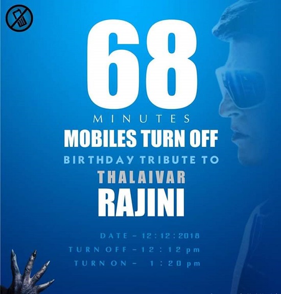 हाल ही में रजनीकांत की फिल्म 2.0 रिलीज़ हुई है। साढ़े 600 करोड़ की कमाई कर चुकी इस साइंस फिक्शन फिल्म में भविष्य में मोबाइल से होने वाले ख़तरे के बारे में संदेश दिया गया है। ये बताया गया है कि मोबाइल की तरंगों से कैसे पक्षियों को नुकसान पहुंचता है। फैन्स ने इसी को मद्देनज़र रखते हुए रजनीकांत के जन्मदिन पर 68 मिनट तक अपने अपने मोबाइल फोन बंद रखने की अपील की है। 12 दिसंबर को दोपहर 12 बजकर 12 मिनट पर मोबाइल फोन्स बंद कर दिए जाएंगे और एक बजकर 20 मिनट पर उसे खोला जाएगा। सभी से अपील की गई है कि रजनीकांत की जन्मदिन पर उन्हें शुभकामना देने के लिए लोग ऐसा करें।