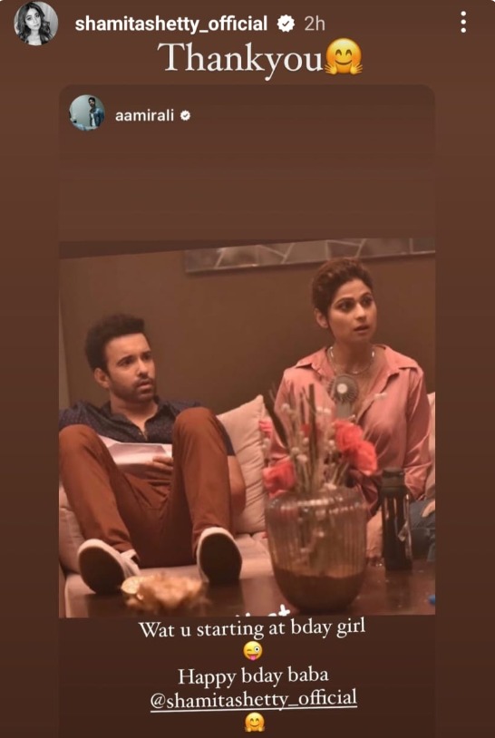 शमिता शेट्टी को विश करने के लिए आमिर अली ने अपने इंस्टा स्टोरी पर एक तस्वीर शेयर की है। फोटो में दोनों किसी चीज को हैरानी से देख रहे हैं। पोस्ट के साथ आमिर ने विश करते हुए एक्ट्रेस के लिए लिखा, "बर्थडे गर्ल तुम किसे घूर रही हो। हैप्पी बर्थडे बाबा।" आमिर के इस बर्थडे विश पर रिएक्ट करते हुए शमिता ने भी इसे अपनी इंस्टा स्टोरी पर शेयर किया और शुक्रिया कहा।