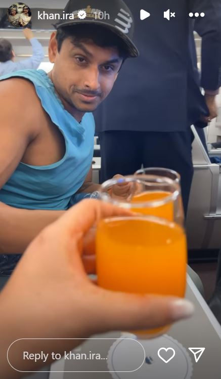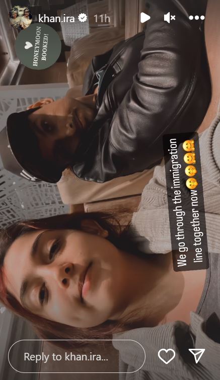आइरा ने इंस्टाग्राम स्टोरी से नुपूर शिखरे के साथ एक तस्वीर शेयर की है, जिसमें दोनों एयरपोर्ट पर इंतजार करते हुए नजर आ रहे हैं। फोटो के साथ आइरा ने कैप्शन में लिखा, "हनीमून बुक्ड। हम एक साथ इमिग्रेशन लाइन से गुजरे।" एक तस्वीर में आइरा और नुपुर फ्लाइट में ऑरेंज जूस का लुत्फ उठाते हुए नजर आए।