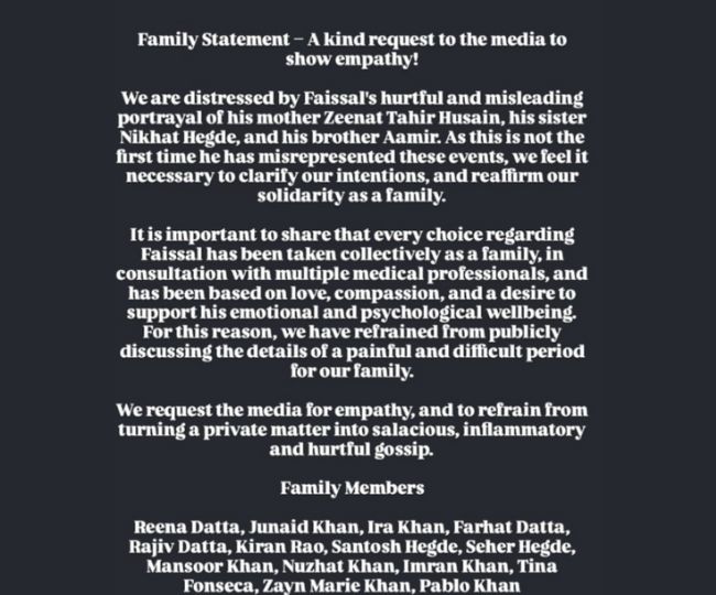 फैसल की तरफ से अपनी माँ जीनत ताहिर हुसैन, अपनी बहन निकहत हेगड़े और अपने भाई आमिर के बारे में जिस तरह से अपमानजनक और भ्रामक बातें की हैं, उससे दिल को काफी ठेस पहुंची है।चूंकि यह पहली बार नहीं है जब उन्होंने इन घटनाओं को गलत तरीके से पेश किया है, इसलिए हमें अपने इरादे स्पष्ट करने और एक परिवार के रूप में एकजुट होकर मामले पर राय रखना जरूरी है।