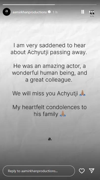 अभिनेता आमिर खान के प्रोडक्शन हाउस के बैनर के आधिकारिक इंस्टाग्राम पर एक इमोशनल नोट शेयर किया गया। इसमें लिखा गया कि 'अच्युत जी के निधन के बारे में सुनकर मुझे बहुत ज्यादा दुख हुआ। वह एक बेहतरीन अभिनता, एक अद्भुत इंसान और एक महान सह-कलाकार थे। हम आपको हमेशा याद करेंगे अच्युत जी। उनके परिवार के लिए मेरी संवेदना है।'