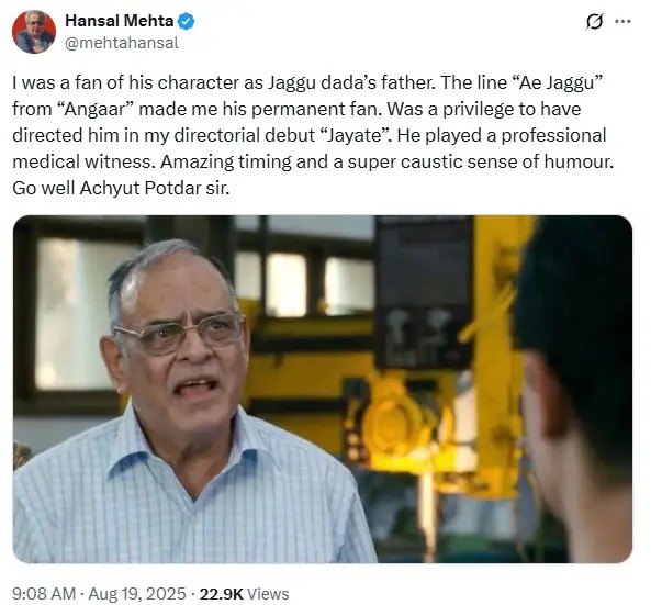 डायरेक्टर हंसल मेहता ने दिग्गज एक्टर को याद किया और उनके लिए एक्स अकाउंट पर उनके लिए एक पोस्ट शेयर की। इसमें उन्होंने लिखा, 'मैं जग्गू दादा के पिता के रूप में उनके किरदार का सबसे बड़ा प्रशंसक था। अंगार फिल्म के 'ऐ जग्गू' वाले डायलॉग ने मुझे उनका फैन बना दिया। अपने करियर की पहली फिल्म में मेरे लिए उन्हें निर्देशन कनरा सौभाग्य की बात थी। अच्युत बहुत अच्छे इंसान थे।'