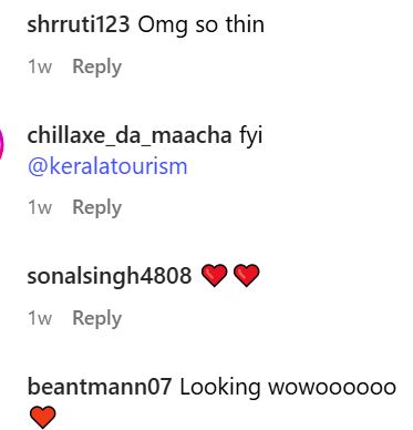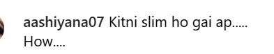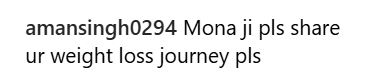 एक यूजर ने कहा, "आपका आधा हिस्सा कहां गया? इतनी पतली। हालांकि, अच्छी लग रही।" एक ने कहा, "मोना फ्रेश लग रही है।" एक यूजर ने कहा, "आपका फिटनेस प्लान क्या है?" एक और ने लिखा, "मोना जी प्लीज अपनी वेट लॉस जर्नी शेयर कीजिए।" एक और ने लिखा, "कितनी पतली हो गई हो आप। कैसे?" एक और ने कमेंट किया, "ओह माय गॉड इतनी पतली।"