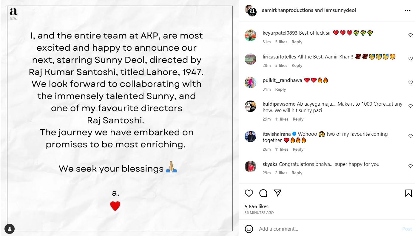 "मुझे और मेरी पूरी आमिर खान प्रोडक्शन टीम को ये बताते हुए बहुत ही खुशी हो रही है कि हमारी अगली फिल्म सनी देओल के साथ है। इस फिल्म का निर्देशन राजकुमार संतोषी कर रहे हैं। इसका टाइटल लाहौर 1947 है। हम बहु प्रतिभाशाली अभिनेता सनी देओल और मेरे पसंदीदा निर्देशक राजकुमार संतोषी के साथ जुड़कर बहुत ही खुश हैं। जिस जर्नी की तरफ बढ़ रहे हैं उसके लिए वादा करते हैं कि वह बहुत ही शानदार होगी। हमें आप सबकी दुआएं चाहिए"।