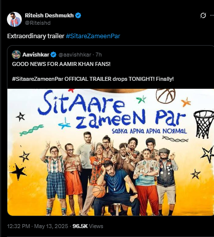 रितेश देशमुख ने फिल्म का ट्रेलर देखा और उसका रिव्यू करते हुए एक एक्स पोस्ट पर जवाब देते हुए लिखा, 'बहुत ही ज्यादा शानदार ट्रेलर है सितारे जमीन पर का'।