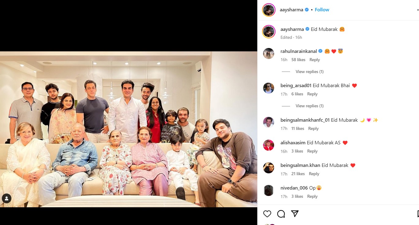 आयुष शर्मा ने जो तस्वीर शेयर की है, उसमें सलमान, अरबाज और सोहेल खान के साथ ही उनके माता-पिता और बच्चे भी नजर आ रहे हैं। इसके अलावा अर्पिता खान, अतुल अग्निहोत्री और हेलेन भी खान परिवार के साथ नजर आ रही हैं। इस तस्वीर को फैंस ने काफी पसंद किया है। आयुष शर्मा की फैन फॉलोइंग से कई यूजर्स ने 'ईद मुबारकबाद' का रिप्लाई देकर इस त्योहार की बधाई दी है।