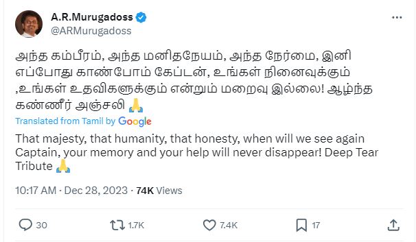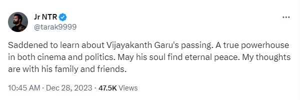 RRR स्टार जूनियर एनटीआर ने विजयकांत ने निधन पर दुःख जताते हुए लिखा, "विक्रम गारू के निधन की खबर सुनकर बेहद दुःख हुआ। वह सिनेमा और राजनीति दोनों ही जगह के पावरहाउस थे। भगवान उनकी आत्मा को शांति दे। उनके परिवार और दोस्तों के साथ मेरी संवेदनाए"।