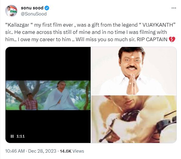 उनके अलावा सोनू सूद ने ट्वीट करते हुए लिखा, "कालाजगर, मेरी पहली फिल्म ही मुझे लीजेंड विजयकांत सर की तरफ से तोहफे के रूप में मिली थी। उन्हें मेरी एक फोटो मिली और अगले ही पल मैं उनके साथ शूटिंग कर रहा था। मेरा करियर उनकी देन है। आपको बहुत याद करुंगा सर। रेस्ट इन पीस कैप्टन"।