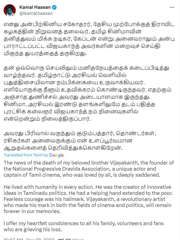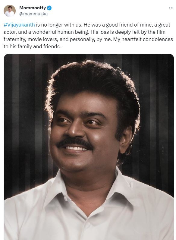 विक्रम के अलावा साउथ सुपरस्टार कमल हासन ने भी एक्टर के निधन पर शोक व्यक्त करते हुए लिखा, "मेरे प्रिय भाई विजयकांत के निधन की खबर से बहुत दुःख पहुंचा है। NPDA (National Progressive Dravida Association) के फाउंडर और तमिल सिनेमा के एक यूनिक एक्टर और कैप्टन को सभी बहुत प्यार करते थे। उनके हर एक्शन में इंसानियत झलकती थी"।