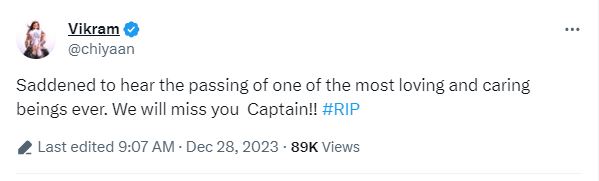 पोन्नियिन सेल्वन स्टार चियान विक्रम ने विजयकांत के निधन पर शोक व्यक्त करते हुए लिखा, "सबसे प्यारे और केयरिंग विजयकांत के निधन की खबर सुनकर बहुत दुख हुआ। हम आपको बहुत याद करेंगे कैप्टन"।