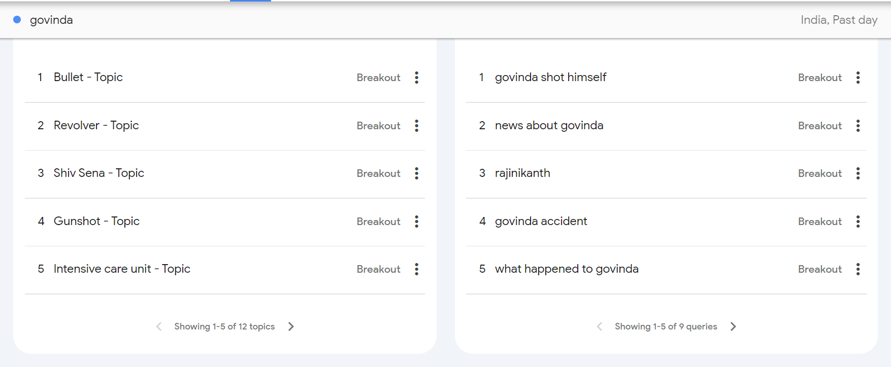 गोविंदा के गोली लगने के बाद से लोग उनसे जुड़े कई कीवर्ड गूगल पर सर्च कर रहे हैं।