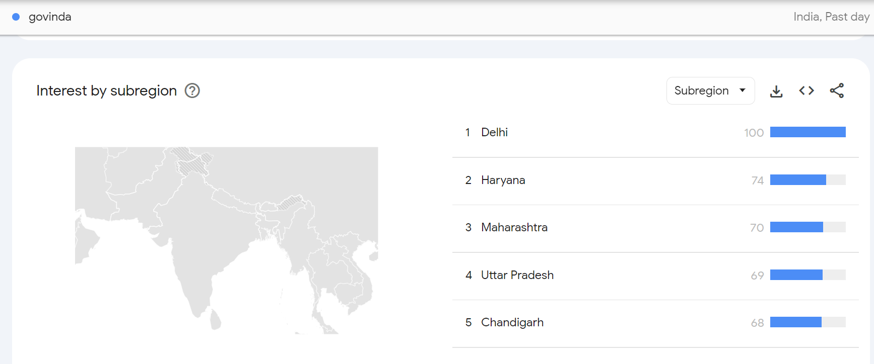 बात करें देश के अलग-अलग हिस्सों की, तो नीचे दी गई तस्वीर में आप यह समझ सकते हैं कि भारत में सबसे ज्यादा गोविंदा को किस जगह सर्च किया गया है। आंकड़ों के मुताबिक गोविंदा को सबसे ज्यादा दिल्ली में सर्च किया गया। इसके बाद हरियाणा, महाराष्ट्र,उत्तर प्रदेश और फिर चंडीगढ़ का नंबर आता है।