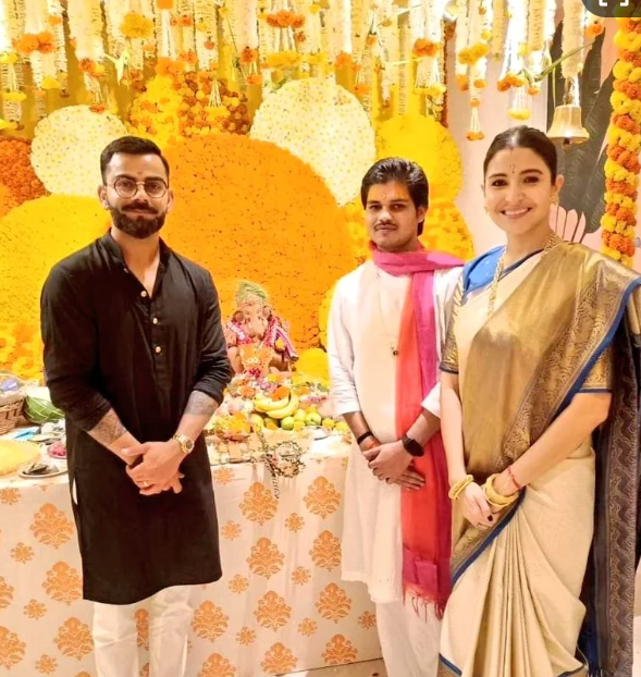 अब सोशल मीडिया पर अनुष्का और विराट की अनदेखी तस्वीरें वायरल हो रही हैं। यह तस्वीरें भी गणपति उत्सव से जुड़ी हुई हैं। रेडिट पर यूजर्स ने विराट और अनुष्का के गणपति उत्सव की कुछ तस्वीरें शेयर की हैं। फोटो में अनुष्का नीले बॉर्डर वाली साड़ी में दिखाई दे रही हैं। इस फोटो को देख कर कुछ लोगों ने अनुष्का की तारीफ की, वहीं कुछ ने कहा कि एक्ट्रेस ने साड़ी काफी बेढंगी ढंग से पहनी थी।