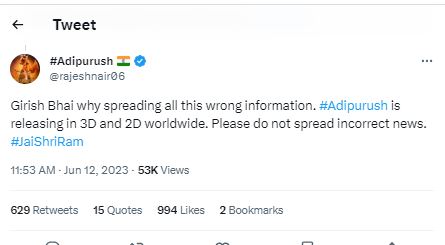 उनके इस वायरल ट्वीट के बाद सोमवार को रेट्रोफिल फिल्म्स के सीईओ और आदिपुरुष के निर्माता राजेश नायर ने उनके ट्वीट पर जवाब देते हुए लिखा, "गिरीश भाई आप गलत इंफॉर्मेशन क्यों फैला रहे हैं। आदिपुरुष 3D और 2D में दुनियाभर में रिलीज हो रही है, प्लीज इस तरह की गलत न्यूज न फैलाएं"। इससे पहले राजेश नायर ने फिल्म के IMAX थिएटर में रिलीज न होने की जानकारी शेयर की थी।