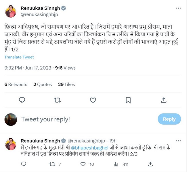 इसके पहले छत्तीसगढ़ के मुख्यमंत्री भूपेश बघेल ने शनिवार को आरोप लगाया था कि फिल्म आदिपुरुष के माध्यम से भगवान राम और भगवान हनुमान की छवि को धूमिल करने का प्रयास किया गया है। उन्होंने इस बात की भी जानकारी दी थी कि कांग्रेस की सरकार इस फिल्म पर राज्य में बैन लगाने का विचार कर सकती है अगर लोगों की ओर से मांग आई तो। उन्होंने यह आरोप भी लगाया की फिल्म के डायलॉग काफी आपत्तिजनक और अभद्र है। उन्होंने कई राजनीतिक पार्टियों की चुप्पी पर भी प्रश्नचिह्न लगाया। उन्होंने अप्रत्यक्ष तौर पर भाजपा पर भी निशाना साधा। रेणुका सिंह ने अपनी ट्वीट में लिखा है,