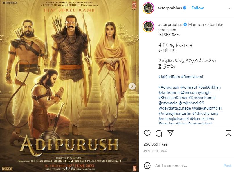 आपको बता दें कि प्रभास और कृति सेनन स्टारर आदिपुरुष 16 जून 2023 को सिनेमाघरों में रिलीज होने वाली है। ‘बाहुबली के बाद अब दर्शक प्रभास को राम के अवतार में देखने के लिए बेसब्री से इंतजार कर रहे हैं। फिल्म का निर्देशन ओम राउत ने किया है।