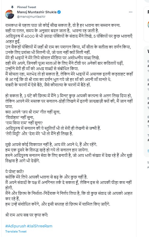 मनोज मुंतशिर ने सनातन धर्म के संदर्भ में ट्वीट में आगे लिखा, ''क्या आपने ‘जय श्री राम’ गीत नहीं सुना, ‘शिवोहम’ नहीं सुना, ‘राम सिया राम’ नहीं सुना? आदिपुरुष में सनातन की ये स्तुतियाँ भी तो मेरी ही लेखनी से जन्मी हैं। ‘तेरी मिट्टी’ और ‘देश मेरे ’भी तो मैंने ही लिखा है। मुझे आपसे कोई शिकायत नहीं है, आप मेरे अपने थे, हैं और रहेंगे। हम एक दूसरे के विरुद्ध खड़े हो गये तो सनातन हार जायेगा। हमने आदिपुरुष सनातन सेवा के लिए बनायी है, जो आप भारी संख्या में देख रहे हैं और मुझे विश्वास है आगे भी देखेंगे।''