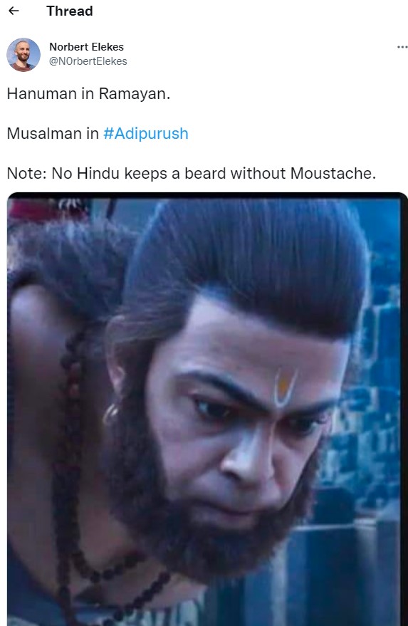 आदिपुरुष में बाहुबली स्टार प्रभास- राघव, कृति सेनन- जानकी और सैफ अली खान- लंकेश के किरदारों में हैं, जो पौराणिक कथा रामायण से प्रेरित है। वहीं, फिल्म में हनुमान का किरदार देवदत्त गजानन नागे निभा रहे हैं। फिल्म के टीजर में उनके शरीर पर चमड़े की बेल्ट को दिखाया गया था, जिसकी वजह से वह सोशल मीडिया पर छाए हुए हैं। अब उनके दाढ़ी पर भी बवाल शुरू हो गया है। एक यूजर ने आदिपुरुष के हनुमान की आलोचना करते हुए कहा, "कौन-सा हिंदू बिना मूंछ के दाढ़ी रखता है जो हनुमान को ऐसा दिखाया गया है।"