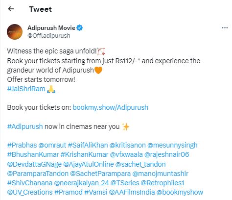 उन्होंने ट्वीट करते हुए लिखा, " इस शानदार कहानी को खुलते हुए देखिये। जल्दी से अपनी टिकट बुक कर लीजिए, जिसका प्राइज सिर्फ 112 रुपए है और आदिपुरुष की इस विशाल दुनिया का आनंद लीजिये। कल से ये ऑफर शुरू हो रहा है। जय श्रीराम"। इसके साथ ही मेकर्स ने ये भी बताया कि अब फिल्म को दोबारा एडिट किया गया है और इसके डायलॉग्स में बदलाव किया गया है।